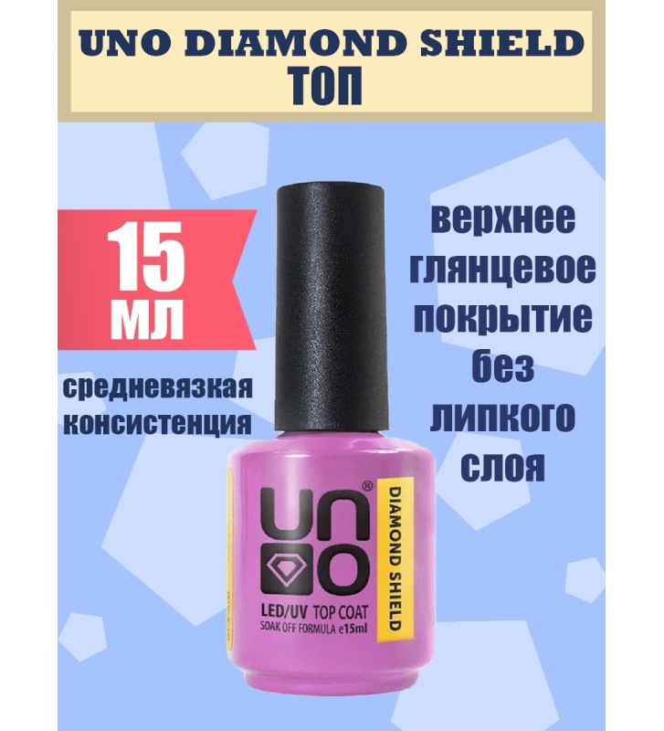 Верхнее глянцевое покрытие без липкого слоя UNO DIAMOND SHIELD 15 мл. обладает средневязкой консистенцией, легко самовыравнивается. Придает цветному покрытию великолепный ультраглянцевый блеск. Инновационная формула без УФ-фильтров в составе топа сохраняет цветные оттенки гель-лака без искажений. Оттенки остаются чистыми, без синих тонов и желтизны. Не имеет остаточного липкого (дисперсионного) слоя после полимеризации в UV/LED лампе. Обеспечивает защиту цветного покрытия от сколов и царапин до 4-х недель.