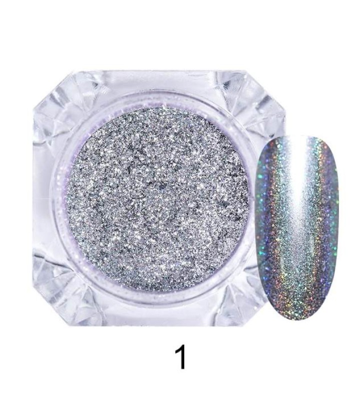 Мелкая блестящая пыль предназначена для дизайна ногтей. Благодаря светоотражающему эффекту образует на поверхности пластины сияющее голографическое покрытие. На подложке черного цвета пигмент проявляется особенно ярко.