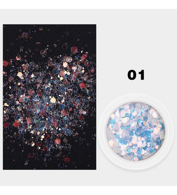 Шестигранные блестки Mix с голографическим песком используются в сухом виде для дизайна ногтей.