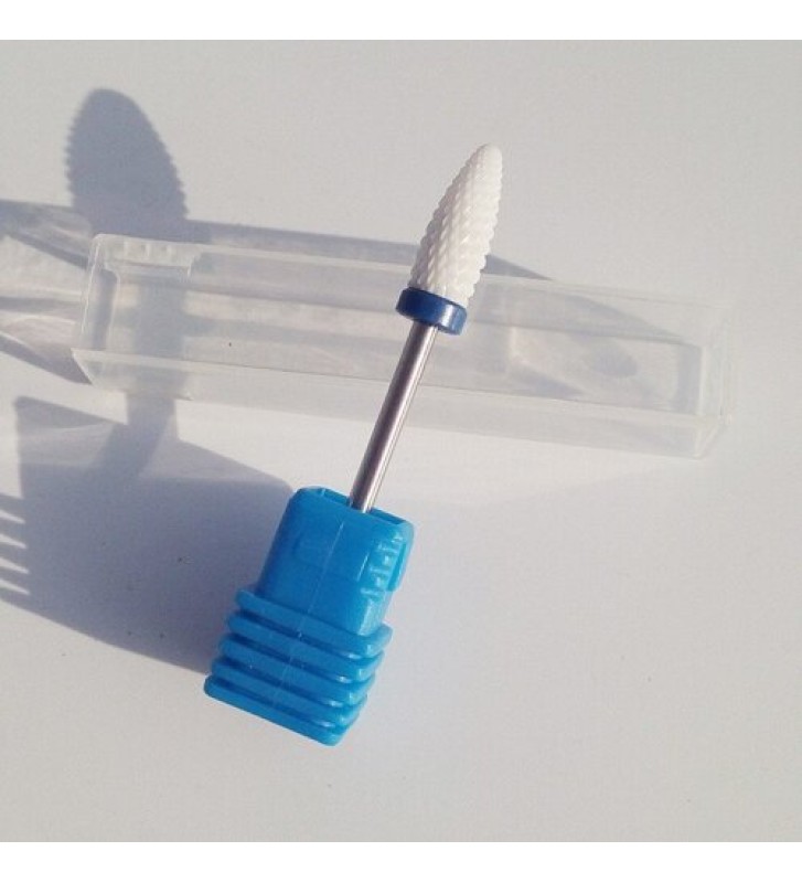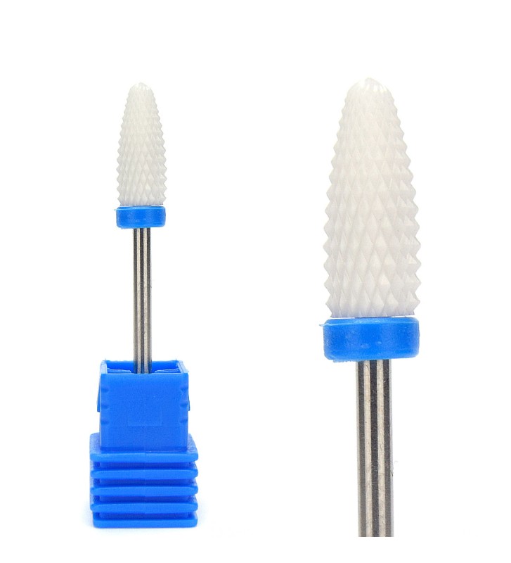Износостойкий материал, ставший основой для создания насадки - керамика, которая во многом превосходит металл, так как тверже и прочнее его. Такая фреза не затупится никогда, и многие мастера называют ее "вечной". Керамическая насадка характеризуется неоднородной структурой, что позволяет придавать опиливаемым поверхностям идеальную гладкость за очень короткое время. Она имеет высокую степень остроты, однако не травмирует ногти и кожу. Особенности керамических фрез заключаются в том, что они не подвержены коррозии, не нагреваются и не забиваются пылью. Прекрасно зарекомендовала себя в медицинском педикюре. Керамические фрезы можно использовать при влажной и сухой обработке.