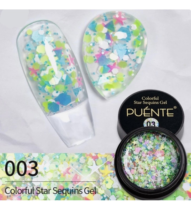 Глитерный гель Puente – невероятный гель на прозрачной основе с голографическими шестигранниками разного размера. Применяется в качестве декоративного покрытия. Не нуждается в опиле. Имеет липкий слой. Большое количество блесток обеспечивает плотное покрытие ногтевой пластины. Также хорошо выглядит нанесенным в виде растяжки.