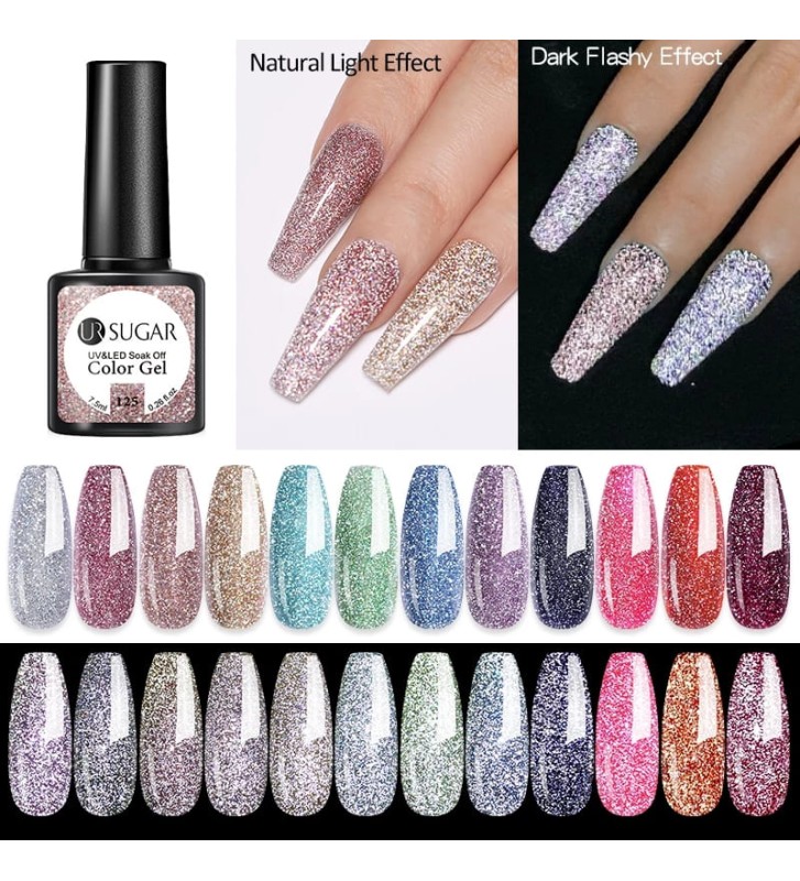 Светоотражающий гель лак Sugar имеет в составе опаловую блеску и светоотражающий песок. При дневном свете сияние блестки. В темное время суток при попадании искусственного света  срабатывает светоотражающий эффект.  Гель лаки со светоотражающими эффектами возможны в использовании как самостоятельный цвет, но с подложкой в тон цвета смотрится гораздо ярче