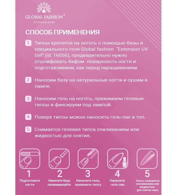 Типсы крепятся на ноготь с помощью базы и “Extension UV Gel”, предварительно нужно отшлифовать бафом поверхность ногтя и подготовить как перед наращиванием. Нанести базу на натуральные ногти и просушить в лампе. Нанести гель на ноготь, прижать типсу и зафиксировать под лампой. Поверх типсы можно наносить гель или гель-лак и топ. Благодаря легкорастворимой soak-off формуле типсы быстро размачиваются жидкостью для снятия гель-лака, а также поддаются спиливанию фрезой.