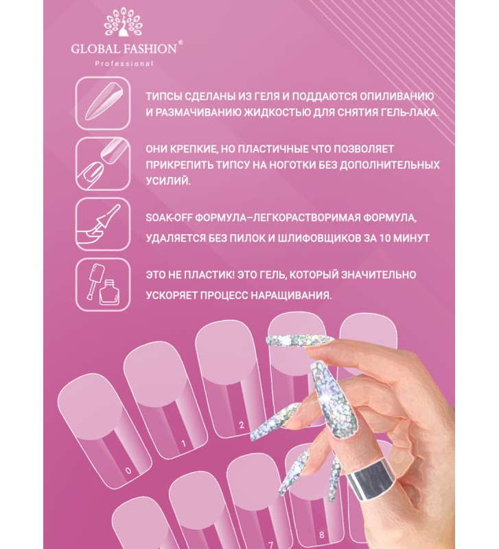Инновация в ногтевой индустрии! Типсы изготовлены из уникального моделирующего гель-полимера, они крепкие, но пластичные, что позволяет прикрепить типсу на ноготки без дополнительных усилий. Важной особенностью и отличием гелевых типсов от обычных пластиковых является то, что они тонкие в зоне ногтевого ложа - 0,3 мм., и более прочные на свободном крае - 0,5 мм. Это обеспечивает минимальный опил возле кутикулы и идеальную носку. Ноготки, нарощенные на гелевых типсах отличаются особенной прочностью и гибкостью, легко выдерживают повседневные нагрузки, амортизируют при ударах и идентичны натуральным ногтям.