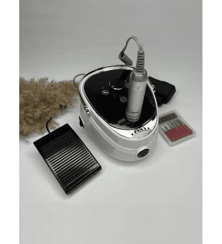 Это профессиональный и универсальный аппарат предназначен для аппаратного маникюра, педикюра и коррекции гелиевых и акриловых ногтей. В комплект входит блок питания, ручка, держатель для ручки, реостатная ножная педаль, набор насадок и одноразовых колпачков. Ручка микродвигателя лёгкая и небольшая, удобно лежит в руке.