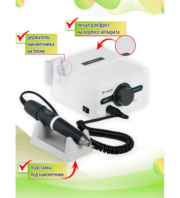 Как и у Стронга 210-го, на блоке управления, в данной моделе расположились тумблеры: «OFF/ON», «FWD/REV» (Реверс), «HAND/FOOT», разъемы для подключения микромотора, педали и питания. На передней панели присутствует регулятор, для плавной регулировки оборотов от нуля до максимальных значений. Десять технологических отверстий на корпусе выполняют функцию пенала для фрез. Пенал отлично экономит время во время процедур маникюра, так как все рабочие насадки всегда на виду и в одном месте.