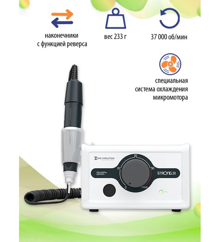 Фрезер Strong 211 (B135)/105L - эволюционное продолжение легендарной 210-ой серии. Strong 211 изначально разрабатывался с учетом повышенных требований опытных мастеров маникюра и педикюра, работающих в Nails-индустрии не первый год. Изучив и устранив все технические нюансы давно полюбившегося Strong 210, корейские инженеры разработали его усовершенствованную модификацию.