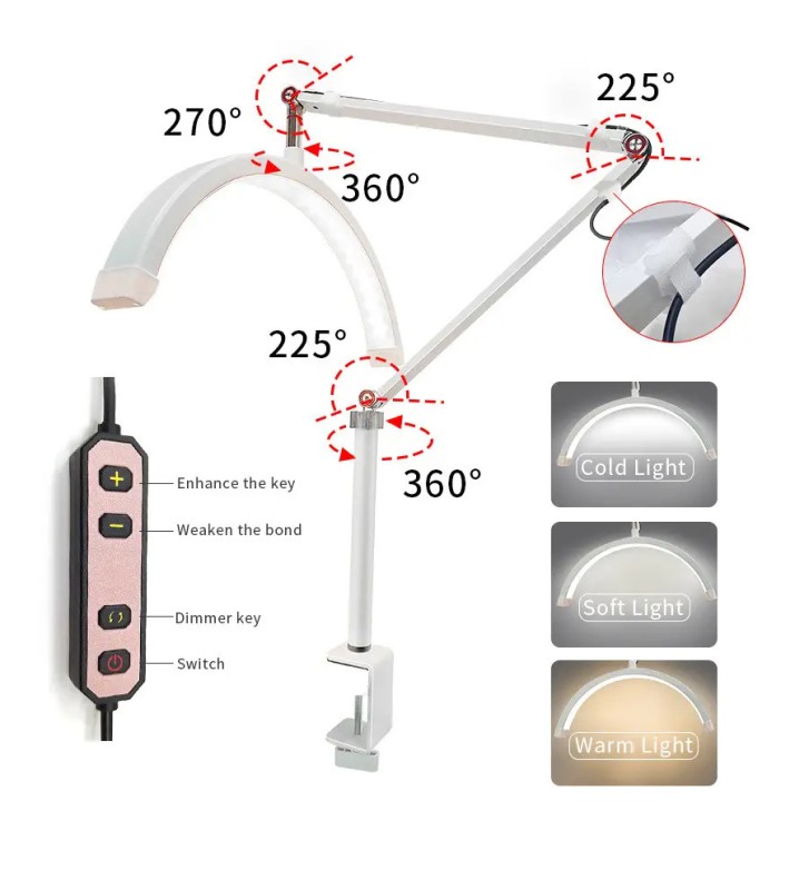 Лампа основана на новейшей технологии – расположения светодиодов по дуге, что делает её настоящей бестеневой лампой. Это позволяет осветить любую рабочую область без теней и бликов. Свет от лампы мягкий, не дает тени, что позволяет увидеть даже самые маленькие и светлые волоски.