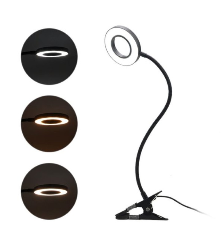 Вращается на 360 градусов. Имеет 10 уровней регулировки света. Мощность 5 Вт. Крепится на поверхность с помощью прищепки.