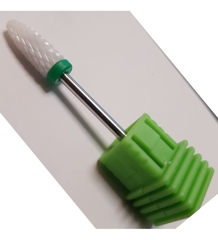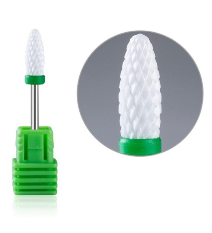 Износостойкий материал, ставший основой для создания насадки - керамика, которая во многом превосходит металл, так как тверже и прочнее его. Такая фреза не затупится никогда, и многие мастера называют ее "вечной". Керамическая насадка характеризуется неоднородной структурой, что позволяет придавать опиливаемым поверхностям идеальную гладкость за очень короткое время. Она имеет высокую степень остроты, однако не травмирует ногти и кожу. Особенности керамических фрез заключаются в том, что они не подвержены коррозии, не нагреваются и не забиваются пылью. Прекрасно зарекомендовала себя в медицинском педикюре. Керамические фрезы можно использовать при влажной и сухой обработке.