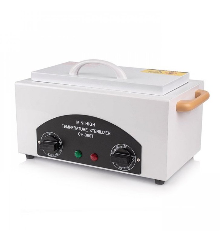 CH-360T имеет дисплей с двумя барабанами: один регулирует температуру (до 220 ℃) с индикатором зеленого цвета, который горит, когда аппарат нагревается. Второй выставляет температуру (до 60 минут) с красным индикатором, указывающим на работу стерилизатора.